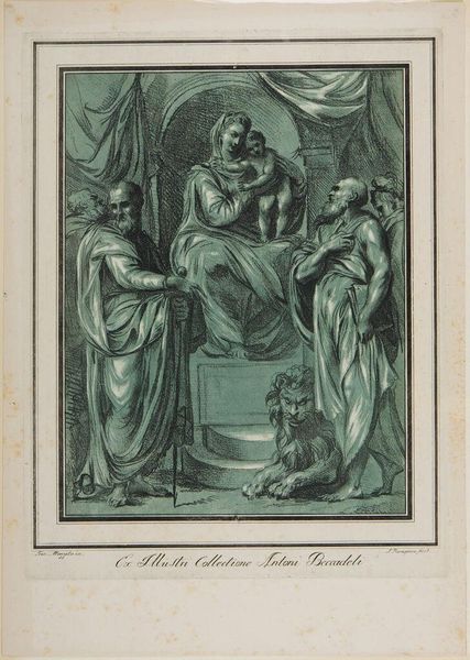 Curator: Jean Jacques Aliamet created this intaglio, titled "Fanaticism." Editor: Well, the first thing that strikes me is the theatricality. It has all the drama of a stage set. Curator: Note the column, heavy drapes, and the dramatic gestures of the figures. The print employs classical references to critique religious extremism. Editor: It's fascinating how Aliamet uses that classical imagery, normally associated with reason and order, to expose the chaos of religious fervor. Who gets to define "reason" here? Curator: Indeed. The print offers a potent commentary on how power can be manipulated through ideology, highlighting the dangers of unchecked belief. Editor: It also seems to echo contemporary conversations about the role of propaganda and manipulation in shaping public opinion, doesn't it? Curator: Absolutely, and perhaps that’s why this piece still resonates. Editor: It reminds us that questioning narratives is as critical now as it ever was.