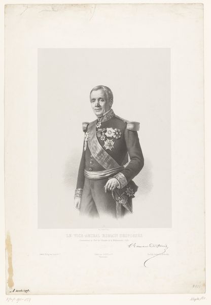 Editor: Here we have Johan Hendrik Hoffmeister’s pencil drawing, “Portret van Henri de Perponcher,” created sometime between 1851 and 1883. The detail is striking! All of the medals… it makes me wonder, what symbols stand out to you in this piece? Curator: Beyond the individual, what resonates are the symbols of power so meticulously rendered. Medals, the sash, the severe uniform... these aren’t mere decorations, they are the visual language of authority, specifically coded and understood by his contemporaries. Note how they cluster near the heart—suggesting the very essence of his being is intertwined with duty. Does the precision of the drawing amplify this effect, do you think? Editor: I see what you mean! The heart is where he wears the symbols. And the crisp detail does make them feel important. Does the artist's choice of pencil add anything? Wouldn't oil have seemed more...regal? Curator: Exactly! Oil paint traditionally speaks of permanence, of inherited power, the grand dynastic portrait. The pencil, by contrast, introduces a certain vulnerability. It is a medium more aligned with the sketch, the study, the *process* of representation. Does this hint at a society grappling with the very notion of inherited power in the late 19th century? A slight questioning? Editor: Interesting! So maybe the medium softens the message a little? Almost like it acknowledges a shift in how power was viewed at the time? Curator: Precisely! It’s a fascinating tension: a portrait meticulously rendered with symbols of unwavering authority, yet executed in a medium that whispers of change and impermanence. It reminds us that even the most rigid symbols are interpreted, and re-interpreted, over time. Editor: I’ll definitely look at other portraits from this era with new eyes. Thanks for pointing all that out. Curator: A pleasure. Symbols gain meaning from dialogue, from repeated observation across a culture, or else, what purpose do they serve?