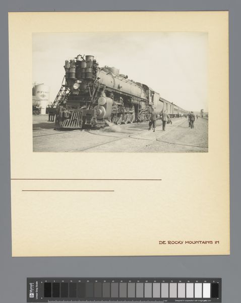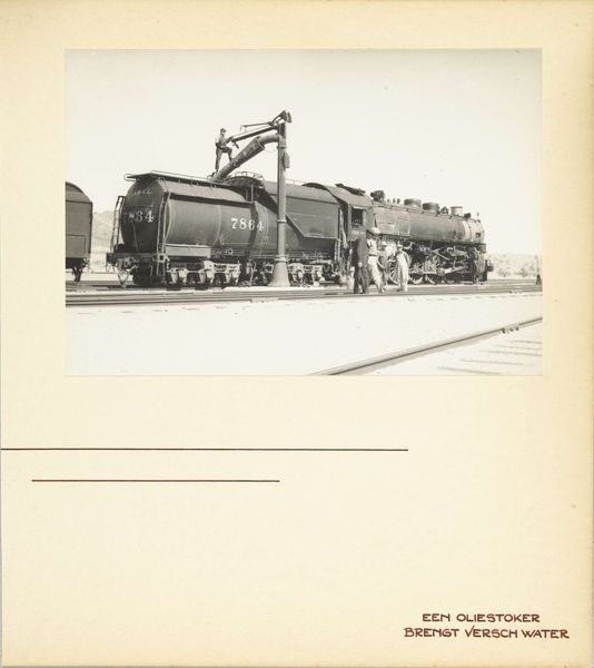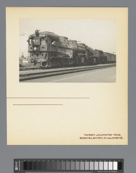 Editor: This gelatin silver print, taken in 1936 by Wouter Cool, captures two figures, likely Cool himself and J.J. Fels, on a train balcony in Glasgow, Montana. I find the composition fascinating; it’s almost like a stage set, highlighting the relationship between the individual and the vastness of the American landscape. How do you interpret this image? Curator: The observation car itself, often situated at the rear, becomes a potent symbol. It's not just a mode of transport but a viewing platform, framing the landscape for these travelers, which inevitably becomes a kind of historical theater. These individuals, posed against this backdrop, become actors on that stage. The image evokes Manifest Destiny, doesn’t it? The train carving a path across a new world. How much of that do you think is deliberate? Editor: That's interesting. I hadn’t considered the possible reference to Manifest Destiny. The flags too, partially obscuring their faces, might suggest a kind of anonymity or a quest for reinvention in this "new world?" But it might just be that they wanted to get some sun on their travels. Curator: True. The flags certainly play with the idea of visibility and concealment. They are both markers of national identity and also things that obscure their identity, blurring it with others. Look too at the almost classical framing of their poses by the railings. To me that symbolizes an attempt to contain that grand historical narrative of Western expansion. The men stand as figures of power but are enclosed, somehow aware of their limited perspective. It's a fascinating juxtaposition. Editor: That is a great insight. It reframes the photograph in my mind – what seems like a simple vacation shot then becomes part of a larger cultural narrative about travel, identity and the taming of the West. Thank you. Curator: And thank you! Seeing familiar symbols through fresh eyes always gives new life to our shared past.