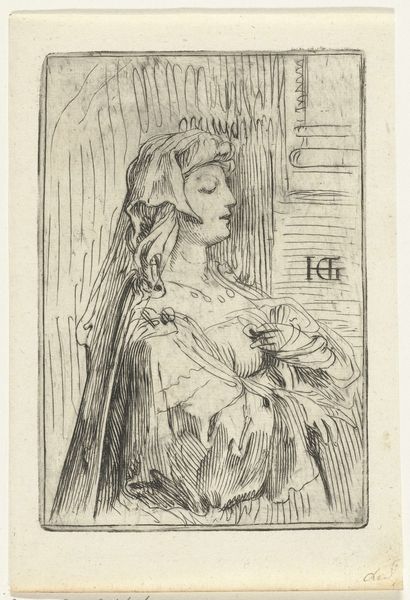 Curator: Immediately, I see pensiveness and a quiet longing emanating from the sitter, a somber intimacy emphasized by the etched lines. Editor: We’re looking at "Portret van een jonge vrouw met hoed die uit het raam kijkt," or "Portrait of a young woman with a hat looking out of the window," a work attributed to Louis Bernard Coclers, active between 1756 and 1817. It’s an etching, almost like a very detailed pencil sketch, typical of Baroque portraiture. Curator: That elaborate hat really captures my attention. The extravagant feathers perched jauntily atop her head suggest an entire performance of status. And the rest of the ornate dress follows that extravagance! But why the melancholy expression? Editor: Court portraiture served multiple functions: recording likeness, sure, but more often proclaiming status. That massive hat is about proclaiming importance, placing the figure in an elite social setting. As for the pensive expression, I’d say artists were increasingly interested in exploring inner psychological states by this period, especially among the nobility. It’s not just surface, it’s hinting at inner depth. Curator: Absolutely, the Baroque era embraced this dramatic tension, visually negotiating the complex social theater of the time. So here, her posture could be a conscious visual presentation and maybe also an unintentional glimpse into vulnerability? Editor: Possibly, but I tend to view that introspection as strategically performative too, fitting neatly within accepted conventions, don't forget it also makes it appeal to the new bourgeoise of that time. That level of fine-tuning allowed those with access to dictate standards of public display and behavior. Curator: It is a carefully considered representation, intended for public consumption. However, the eyes hold so much human truth. They draw the viewer in, almost begging them to decipher the story beneath the image. It suggests a hidden narrative—a personal, psychological world that the finery both reveals and obscures. Editor: Right, and analyzing portraits like these lets us ask compelling questions: How did the elite classes of that era manage to performatively stage images for consumption? And how much of a cultural memory do we, the public, project onto the figure represented through our consumption and historical analyses? Curator: Precisely! Through cultural symbolism, we begin to understand how people, both then and now, continually negotiate this visual, psychological terrain. Editor: Ultimately, in considering what she truly felt, the sitter makes us consider what portraits felt like to their original audiences as well.