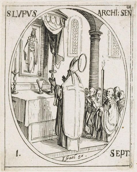 Curator: This is Jacques Callot's "Deposition of the Virgin," a small engraving measuring only about 7.6 x 4.9 cm, currently held at the Harvard Art Museums. Editor: It's incredibly detailed for such a tiny piece. The crisp lines give it a stark, almost severe feeling, and the way the figures are arranged feels so staged and deliberate. Curator: Callot was a master printmaker, renowned for his technical virtuosity in etching and engraving. He captures religious and secular life during a period of conflict, giving us glimpses into the history of devotion. Editor: Look at the labor involved in creating such fine lines! And consider the social aspect too - the tools, the workshop, the market for these religious images in early modern Europe. Curator: Absolutely. These prints circulated widely, shaping religious and cultural attitudes. Editor: Indeed, a potent reminder that even something small can carry significant material and cultural weight. Curator: A powerful intersection of craft, devotion, and the shaping of social narratives, wouldn't you agree?