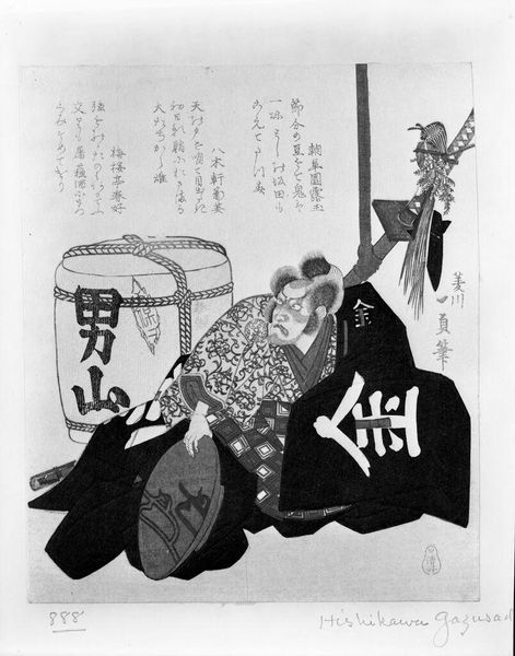 Editor: This is Ippitsusai Bunchō’s “Actor Nakamura Nakazo Drawing a Sword.” The stark black and white contrast really emphasizes the tension of the moment, don't you think? What symbols stand out to you in this image? Curator: The actor's determined gaze, the poised sword, even the pine tree – all are laden with symbolic weight. Kabuki, where Nakamura Nakazo performed, was a highly codified art. His costume, the sword’s angle, likely referenced specific narratives familiar to the audience. Do you see how the fire adds to the drama? Editor: Yes! It feels like a ritual or a test. I never thought about how much information could be conveyed through these visual cues. Curator: Indeed, each element works to evoke a shared cultural understanding. Editor: That's fascinating! It makes me see the print as a window into a whole world of meaning.