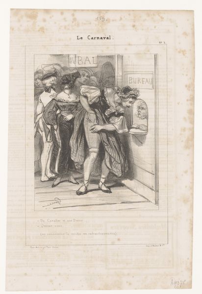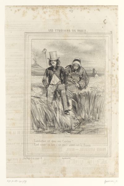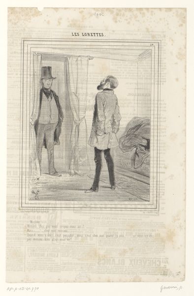 This print, "Kelner moppert op twee deftige heren" – or, “Waiter Complaining to Two Dignified Gentlemen” – was made by Paul Gavarni. Printed images like this were a vital part of the 19th century, a way of disseminating commentary on contemporary life. Gavarni was a master of lithography, a printmaking technique that allowed for relatively quick and inexpensive production. The process involves drawing on a stone or metal plate with a greasy crayon, then applying ink which adheres only to the drawn areas. The printmaker then transfers the image to paper. Look closely, and you can see the subtle tonal gradations achieved through this method. Gavarni exploits this to full effect, capturing the nuances of social tension between the waiter, caught in his apron, and the two well-dressed gentlemen. Lithography allowed artists to reach a broad audience, making it a powerful tool for social critique. It was the ideal medium for commenting on the emerging class divisions of modern Paris.