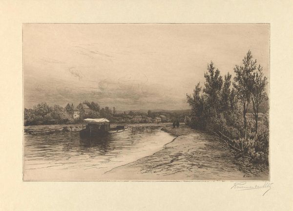This etching, Rivierlandschap, was made by Reijer Lieman, likely in the early 20th century. With its delicate lines and muted tones, it captures a quiet, reflective scene. For me, it’s all about the process; the way Lieman coaxes depth and texture from simple marks. Look at the water, how the reflections of the trees and the sky are rendered with just a few strokes. The surface of the print has a tactile quality, as if you could feel the grain of the paper and the bite of the etching needle. I am drawn to the upper left corner, where the dark mass of trees meets the lighter sky. It’s a study in contrasts, a balance of shadow and light that creates a sense of depth and atmosphere. There is something about the mood of the piece that reminds me of Whistler's nocturnes, that same sense of stillness and contemplation. Ultimately, the real beauty of art lies in its ability to evoke a feeling, a mood, a memory and this little landscape does that beautifully.