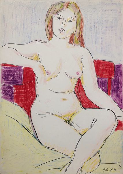 Editor: Here we have Émilie Charmy’s "Reclining Female Nude" from 1921, rendered in oil paint. The composition strikes me as both intimate and a bit confrontational, especially given the subject's gaze. How do you interpret this work? Curator: Charmy, a contemporary of artists like Matisse, offers us here not just a nude, but a challenge to the male gaze dominant in art history. Consider the social context: post-World War I, a period of evolving gender roles and female empowerment. This painting feels like a reclaiming of the female form, doesn't it? The model's direct stare bypasses the objectification typical of many nudes of the time. Editor: That makes sense. It does feel less… passive than some nudes I’ve seen. Curator: Exactly! Look at the brushstrokes – bold, assertive, almost defying conventional beauty standards. The naturalism of the body, including the pubic hair, challenges idealized representations and speaks to a more truthful portrayal of womanhood. How does this shift your initial impression? Editor: It definitely changes things. It's not just a pretty picture; it’s a statement about female agency and representation. The directness you mentioned is powerful. Curator: Indeed. And think about Intimism as a style - often depicting domestic scenes. But here, Charmy offers an unidealized woman, challenging the notions of privacy and exposure. Do you find that it speaks to contemporary discussions about body positivity and female empowerment? Editor: Absolutely! It's fascinating to see how historical art can still resonate with current conversations. Curator: And that is exactly why art history isn't just about the past. Editor: I’ll definitely look at nudes differently from now on! Thanks!