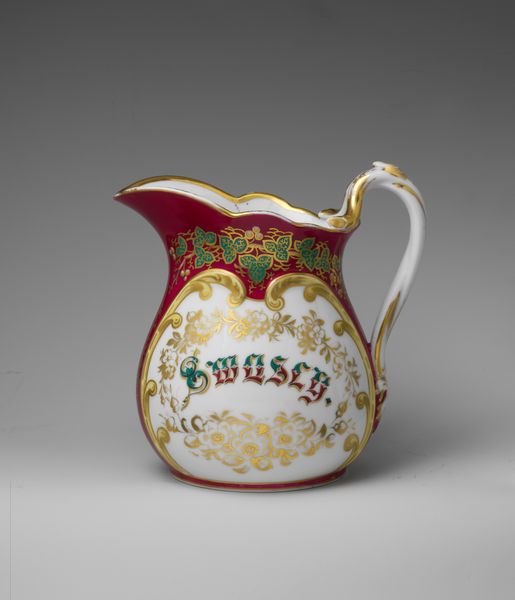 This 'Pitcher' was made by Edward Lycett at an undetermined date using porcelain. At first glance, you’re drawn to the contrast between the stark white of the body and the rich burgundy that adorns the upper section. Consider how the textured, honeycomb pattern in burgundy interacts with the smooth, floral motifs below. Lycett is playing with dualities here: the geometric versus the organic, the opaque versus the translucent, and the controlled versus the free-flowing. The floral design, with its scattering of leaves, acorns and wreaths, is not merely decorative; it is structural. It serves as a transition, guiding the eye upward to the more rigid, almost architectural, upper section. The monogram at the center could be seen as a semiotic anchor, grounding the piece in a specific narrative or identity, while the honeycomb pattern hints at underlying systems of order. It’s a functional object, yes, but also a canvas where ideas about nature, order, and identity converge. The pitcher invites us to contemplate the relationships between form and function, surface and structure.