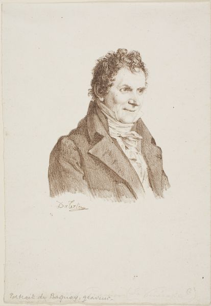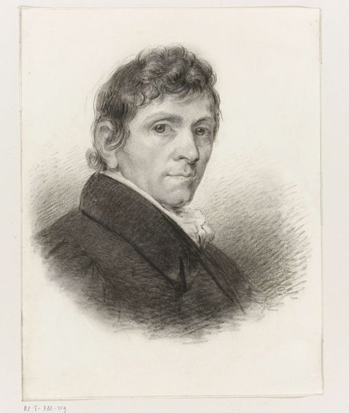 Curator: This is "Portret van een onbekende man," or "Portrait of an Unknown Man," an engraving from 1829 now residing in the Rijksmuseum. Editor: There's an immediate directness about it. It's striking how he seems to stare right through you. It's austere, yet those curls suggest something less serious. Curator: Yes, engravings like this served a specific function within society. Think of them as the mass media of their day. This artwork makes me think of class, status, and the dissemination of identity through print culture. These were frequently commissioned by individuals of status to circulate their likeness and reinforce social hierarchies. Editor: It raises interesting questions about accessibility. While intended to portray status, engravings also democratized image-making to an extent. Did having your portrait 'out there' change people’s relationship to visibility and self-image? Curator: Undoubtedly. While oil paintings were primarily available to aristocracy and the upper class, this form of reproductive art spread across different echelons of society. The portrait becomes more accessible; however, this is usually for people with at least middle-class aspirations. It would be interesting to delve more deeply into the original price, as well as the choices involved with this specific representation, such as the plain background, for instance. Editor: I agree. Consider too that he's an 'unknown man.' This anonymity subverts that aim of reinforcing status and makes me wonder who was able to gain visibility and who was not in this burgeoning age of media. Curator: And how identity was both constructed and sometimes obscured in the process of representation itself. He isn't presented with any accoutrements of power, as could be traditionally portrayed. Editor: Perhaps a statement in itself about the individual versus inherited privilege in this new era? What I appreciate most is how a 'simple' portrait manages to engage such relevant themes of class and power dynamics in media. Curator: It highlights the importance of critically examining how images, even those that appear straightforward, are never truly neutral, always communicating particular messages reflecting broader societal power dynamics. Editor: Precisely. Let’s continue onwards.