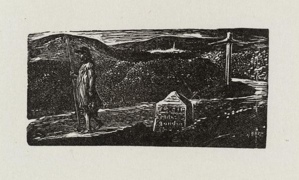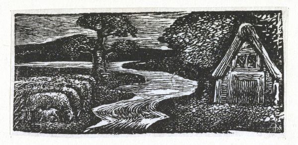 Editor: This is William Blake’s "Sabrina’s Silvery Flood." It’s quite small, a black and white print of a river landscape, and there’s something dreamlike about the sharp contrast. What do you see in this piece, considering its composition? Curator: The stark contrast is indeed a critical element. Notice how Blake uses the black ink to define not only the forms but also the gradations of light and shadow. It’s an exercise in pure form, creating depth and texture through line and shape alone. Editor: So, it’s less about what it represents and more about how it’s constructed? Curator: Precisely. The arrangement of the elements—the river's curve, the density of the trees, the placement of the structure—creates a visual rhythm. Blake masterfully manipulates our gaze. Editor: I see that now! It’s like a dance of dark and light. Curator: Indeed. And by understanding how these formal elements interact, we gain a deeper appreciation for Blake's artistic intention. Editor: That's fascinating; I’ll definitely look at prints differently from now on.