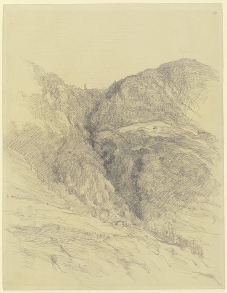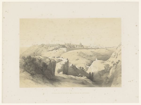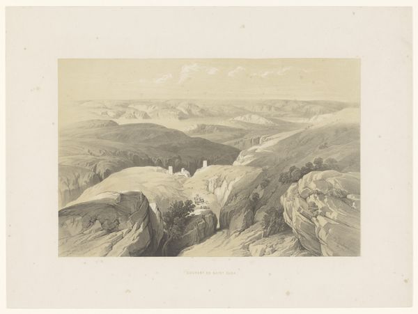 François Stroobant's "Gezicht op de Jordaanvallei" drawing presents a vast landscape rendered with delicate graphite lines. The composition is dominated by the valley, framed by steep, rocky inclines that guide the eye deep into the pictorial space. A muted palette of grays and whites evokes a sense of quietude. The intricate network of lines meticulously describes the geological forms, creating a contrast between the rugged foreground and the ethereal distance. The play of light and shadow enhances the spatial depth, inviting contemplation on the relationship between land, representation, and perception. Stroobant’s careful attention to detail and composition not only captures the physical characteristics of the landscape, but also engages with the Romantic era's fascination with nature and sublime, drawing viewers into a reflective experience mediated through the artist's rendering.