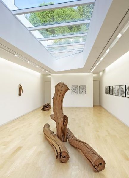 Editor: Right, let’s talk about Giuseppe Penone’s "Repeating the Forest," created in 2014. It's a site-specific installation constructed from wood. My initial impression is a rather melancholic feeling of lost nature; these tree trunks almost feel like ghosts of what once was. What do you see in this piece, viewed from a materialist perspective? Curator: Considering this work materialistically, I'm struck by Penone’s deliberate exposure of process. The act of reduction is key; the artist carves back to reveal the tree’s earlier form. Look at the differing textures: the rough, unworked blocks contrast with the meticulously shaped trunks. How does that interplay between raw and refined materials influence your understanding? Editor: It makes me think about the labor involved. Someone had to physically carve away the wood, enacting a kind of reverse growth. And there's a contrast between the industrial process of cutting down a tree, and the craft of sculpting it. Curator: Precisely! And think about the economic systems involved in sourcing, transporting, and transforming the wood. It brings up questions of sustainability and our relationship with natural resources. Could we even consider the gallery itself as another layer of materiality, a space of display and consumption? Editor: I never thought of it that way, but of course! The pristine white walls highlight the "naturalness" of the wood, while the act of display turns the trees into commodities. Curator: Exactly. Penone’s work cleverly unearths the complex life cycle of a raw material – from forest to gallery and potentially back again, forcing us to confront our role in that circuit. What might that mean to us? Editor: Thinking about it that way adds a completely new dimension. I'd been focused on the surface representation, but the materiality encourages me to consider the underlying socio-economic structures at play. Thanks for making this more visible. Curator: It works both ways, reflecting about it collectively is crucial to approach new readings, and interpretations.