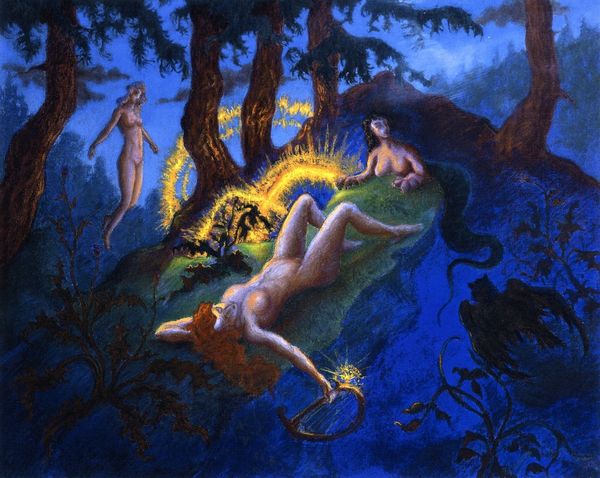 Editor: This untitled oil painting by Paul Ranson depicts a scene in a forest with nude figures. It's dreamy and the colors are vibrant, yet the figures seem somewhat melancholic. How do you interpret this work? Curator: I see a conscious effort to evoke a sense of primeval innocence. The nude figures nestled within the verdant embrace of the forest harken back to an idealized, pre-civilized state. Notice how Ranson uses light and shadow - the figures almost emerge from the forest. Editor: I do see that now. Their pale skin contrasts with the rich greens and browns. Are these figures symbolic, perhaps of something beyond a simple woodland scene? Curator: Precisely! The recurring presence of nude figures in art, particularly from the Symbolist movement onward, often represents a deeper connection to nature, a rejection of societal constraints, and a longing for spiritual purity. It seems like Ranson positions these figures in a shared cultural memory. How do they resonate with you? Editor: They make me think of nymphs or deities from mythology, displaced into a more modern context. There’s a certain ambiguity about them, like they belong to both worlds. Curator: An excellent observation. This ambiguity is key. Ranson invites us to contemplate the relationship between humanity and the natural world, and also challenges the viewer to revisit and reconsider myths. This is a forest, and perhaps also, a state of mind. The animals there add another layer of the symbolic web; were those rabbits traditionally connected to similar myths and allegories? Editor: I hadn't even considered the rabbits, but I see them now, as reminders that this is a shared space between humans and the natural world. I really didn't expect to see the cultural implications there. Curator: Absolutely, we are all on a continuous journey through this ever-evolving symbolic labyrinth.