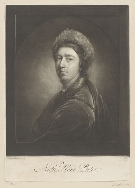 Pieter Louw made this self-portrait using a printmaking technique. It is known as mezzotint, sometime in the late 18th century. This technique involves preparing a copper plate to hold ink by uniformly roughening its surface. A tool called a rocker is used to create tiny indentations, ensuring that if inked, the plate would print solid black. The image is then created by selectively smoothing areas of the plate with burnishers and scrapers, allowing these areas to hold less ink and print lighter tones. Louw's mastery is evident in the subtle gradations of light and shadow. Note the velvety blacks of his cap and coat which contrast with the delicate highlights on his face. This wasn't just about artistic skill; it was about the labor-intensive process of manipulating the plate. Each mark is the result of careful work, a testament to the value placed on craft and skill. Looking at this print, we can appreciate not only the final image, but the history of labor and skill embedded within its very surface.