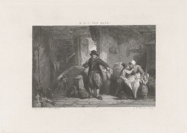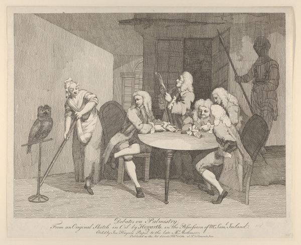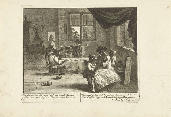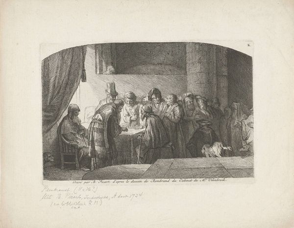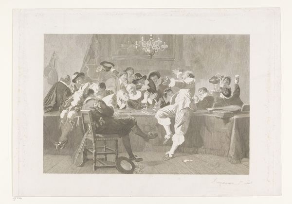 Dirk Jurriaan Sluyter created this print, called "De Rijke Tafel", which translates to "The Rich Table", at an unknown date. The print plunges us into a scene of convivial dining, marked by a composition of stark contrasts in light and shadow. The artist's use of hatching and cross-hatching to create tone emphasises the weight and texture of the scene. The arrangement of figures around the table suggests a structured hierarchy. The way Sluyter uses vertical and horizontal lines constructs and reinforces meaning; vertical lines delineate figures and architectural features, while horizontals anchor the scene, creating a stable yet hierarchical tableau. Notice how the composition, reminiscent of Dutch Golden Age interiors, invites us to examine the visual and social dynamics at play. This work prompts questions about the cultural codes embedded in such scenes. It encourages us to decipher the meanings and values attributed to wealth, class, and social interaction.