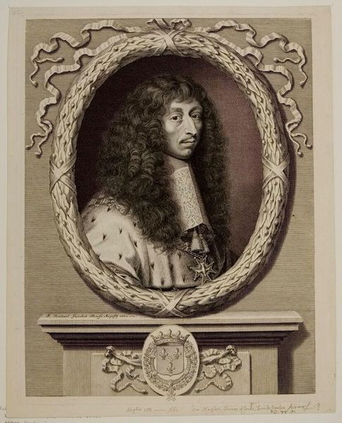 Editor: This is Robert Nanteuil's portrait of Louis II, Prince de Condé. The elaborate frame and coat of arms give it a very formal feel. What symbols stand out to you? Curator: The laurel wreath, the flowing ribbons, the coat of arms... They're all symbols of triumph and nobility, recalling classical antiquity and connecting Condé to a lineage of power. What emotions do these symbols evoke in you? Editor: A sense of formality, for sure, but also maybe a hint of self-importance. Curator: Indeed. Nanteuil captured not just a likeness, but an era's understanding of power, projecting an image the Prince wanted to convey. It's a carefully constructed cultural memory. Editor: I hadn't considered the "constructed" aspect before. Thanks! Curator: My pleasure. It’s a reminder that images are never neutral.