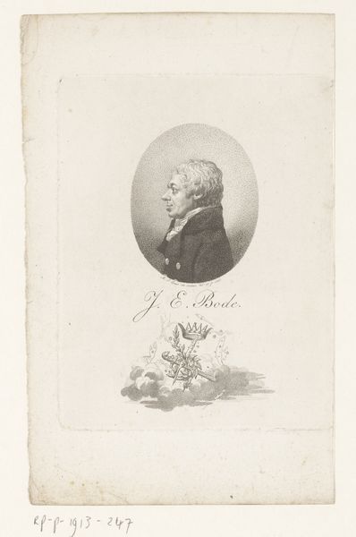 Editor: This is a portrait of Johannes von Müller, created between 1766 and 1831 by Johann Michael Siegfried Lowe. It's a drawing, done with graphite – very delicate, almost like an old engraving. It feels very… serious. A profile view, meticulously rendered. What strikes you most about this work? Curator: The delicacy is precisely it, isn't it? There’s a quietness here, a studious air about Herr von Müller. It's more than just a portrait, it's almost an intimate glimpse. Do you notice the miniature scene beneath the portrait? What story do you suppose that tiny ensemble is enacting? Editor: I hadn’t really paid attention! They look like they're dancing or celebrating...something quite joyful compared to his serious profile above. Is there a connection, perhaps a contrast, that Lowe was trying to highlight? Curator: Precisely! Lowe was quite clever here. The austerity of the neoclassical portrait contrasts beautifully with the carefree figures below. Perhaps it's Lowe’s playful commentary on Müller's life, his public persona versus private joys. Art is, after all, just a mirror, and what we choose to reflect… that's the riddle. And how skillfully Lowe captures that ambivalence through the juxtaposition of sober form and lighthearted narrative. It is quite bewitching, wouldn't you say? Editor: Absolutely! Seeing that little scene definitely shifts my perspective. I initially saw it as just a serious portrait, but it's got so much more going on. It really gets you thinking. Curator: That tension, that delightful push and pull, is where the magic happens, isn't it? It nudges us to ponder, to ask, to reimagine… and isn't that what great art should do? It starts a conversation, long after the artist has put down their graphite. Editor: Definitely, I'll never look at portraits the same way!