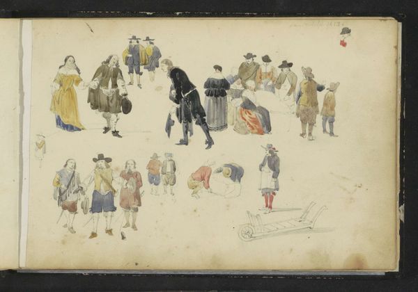 Curator: Well, here we have Cornelis Springer's "Mannen in zeventiende-eeuwse kleding," a drawing made between 1852 and 1859. It’s currently held in the Rijksmuseum. Editor: It's a collection of sketched figures on paper, in ink, watercolor and pencil. The immediate impression is almost theatrical. Like costume studies for a play. Curator: That’s perceptive. Springer was fascinated by history and often depicted scenes from the Dutch Golden Age. This drawing shows studies of figures in clothing of that era, acting as memory of a foundational time. The costume functions as cultural artifact. Editor: Looking closer, I’m struck by how he captures the texture and weight of the fabrics with such economical lines. Notice the contrast between the sharp detail in the hats and the more loosely rendered cloaks. Semiotically, the arrangement itself is quite interesting: some characters facing forward while others turn to reveal the garments on their back. Curator: Precisely. The clothing tells a story. The high hats suggest affluence or a certain social status. It evokes memories of a hierarchical society, a very important memory within Dutch society to this day. It suggests the complexities of life during that time. It also recalls archetypes of justice and inequality still familiar in modern Dutch life. Editor: And the limited palette focuses us on form rather than surface ornamentation. The arrangement on the page seems informal, almost like notes. Perhaps it functions more like a catalog than a unified tableau. But this too becomes symbolic as the men are not frozen within an immutable landscape, but rather mutable and nomadic across the landscape of the page itself. Curator: An insightful consideration! His study becomes a cultural mirror, showing aspects of class and bearing. We project what we know and who we believe these individuals to have been in reality based only on attire. These historical memories carry through his works. Editor: Indeed, I came in thinking of garments and form, but now my gaze is refocused by how artfully Springer renders these traces, the interplay of materiality and visual narrative. Curator: And my viewing now reveals a deep understanding of a cultural continuity that persists over time within Dutch identity and history, one where costume carries more value than simple adornment.