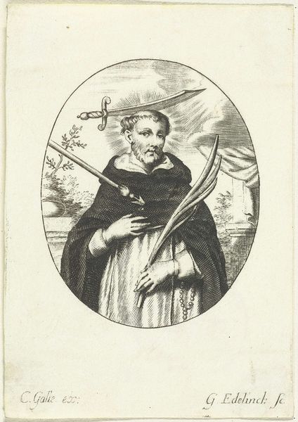 Editor: We're looking at a portrait of Ottone Visconti, made between 1549 and 1575. It’s an engraving, and what strikes me immediately is the way he holds these objects - a cross and what seems like a scepter. What do you read in these symbols? Curator: The cross and scepter indeed speak volumes. Notice how they're presented: the cross, usually a symbol of sacrifice and redemption, and the scepter, representing authority. Placed together like this, they visually narrate Visconti's power. It suggests a union of spiritual and secular authority. The gaze directed away from the viewer also plays a crucial role, no? Where does it lead us? Editor: That’s a really interesting point. The gaze almost hints at some distant goal or higher purpose that he is striving toward, away from immediate concerns. Given his role, do you see any specific intent to project the kind of image this communicates? Curator: Precisely. This image is rich with the iconography of leadership in a religious context, as seen in how other historical leaders portray themselves, like Charlemagne holding similar symbols of divine and temporal power. This visual vocabulary reinforces Visconti's lineage, legitimacy, and alignment with divine will. Don’t you find the frame adds another layer? Editor: Absolutely! The ornate border seems almost like it's declaring his importance, framing him within this elaborate setting. It really emphasizes the idea of presenting a specific image. What stays with you the most after considering it? Curator: It is the lasting resonance of how symbols crafted centuries ago can still inform our understanding of power and representation today. Editor: I now better understand how art builds cultural memory by encoding leadership traits through carefully placed visual symbols, even in portraiture. Thanks for walking me through the cultural history!
