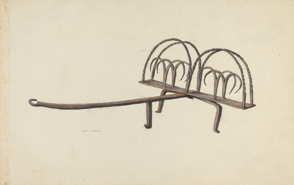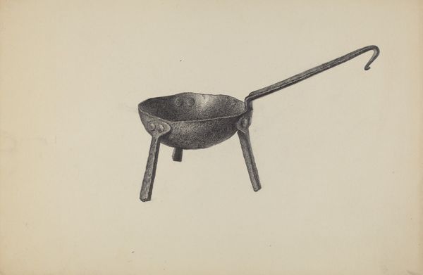 Here we have Salvatore Borrazzo’s drawing of a trivet made with graphite on paper. Borrazzo was active during the first half of the 20th century when there was a renewed interest in early American crafts and design. What does it mean to consider this metal object through the medium of graphite on paper? While the trivet has a clear functional identity, the drawing of it renders it something else entirely. There is the identity of the object itself, a common household item, but also of those who would have used it. Borrazzo himself was part of the Index of American Design, a program of the Works Progress Administration, which employed artists to record examples of American material culture. The drawing asks us to consider the object and its place within a broader narrative of American identity, labor, and economic hardship. The simple beauty and careful craftmanship asks us to consider the labor necessary for its creation.