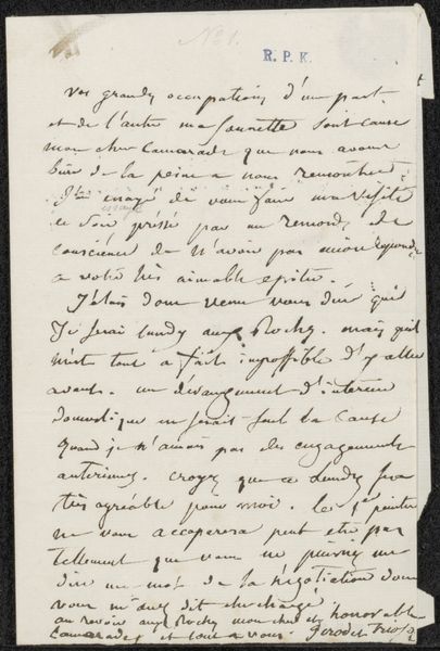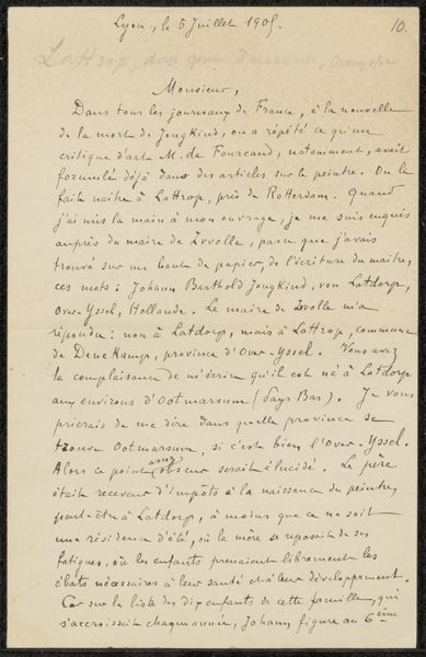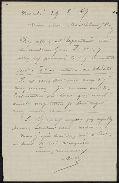 This is a letter written in 1876 by Adolphe Mouilleron. It’s made with paper, and written with ink in cursive. The materials and processes used here are not particularly unique, but they are highly indicative of the period. Consider the labor involved: the harvesting of rags to make the paper, the grinding of pigments to make the ink. Even the handwriting itself is a kind of craft; Mouilleron would have spent years perfecting his penmanship. What we see here is not just information, but a social relationship embodied in material form. Think of the way we dash off an email today; this was a much more considered, even precious, mode of communication. The very fact that this letter has been preserved in a museum speaks to the cultural value we place on such artifacts. It’s a poignant reminder that even the most mundane materials can carry profound historical significance. By looking closely at the materiality of this letter, we can gain a deeper understanding of the social and economic conditions that shaped its creation.
