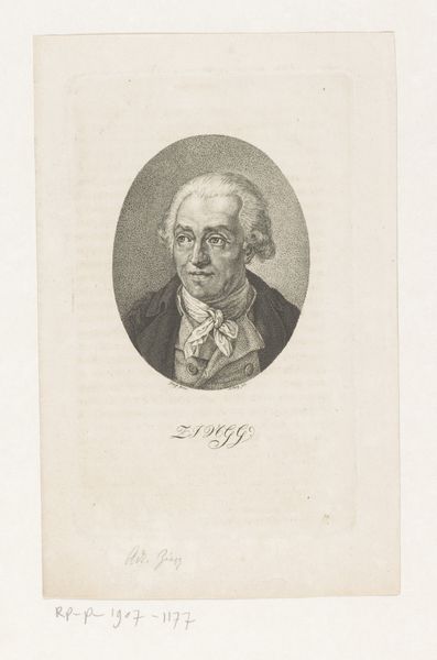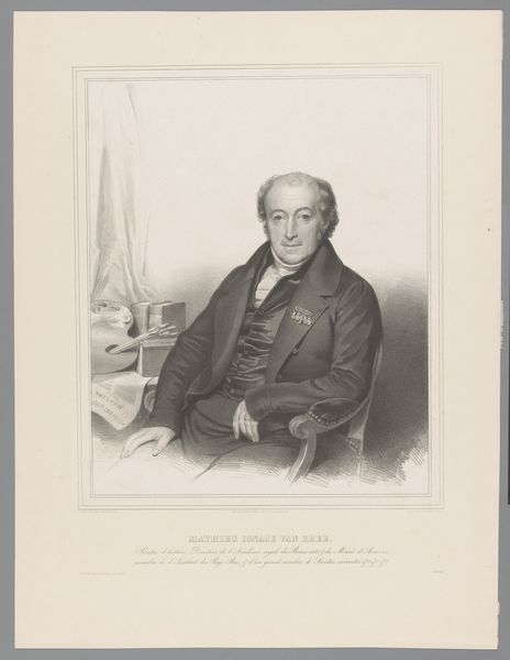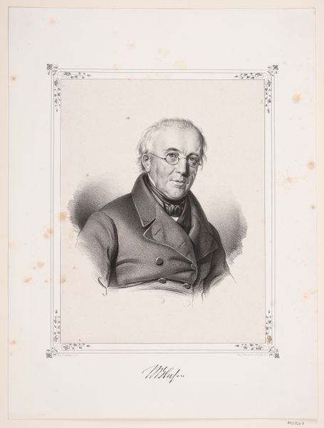 Curator: This is a lithograph dating from the 1840s. It depicts H. C. Ørsted, rendered by Emil Ditlev Bærentzen and held in the collection of the SMK, the National Gallery of Denmark. Editor: My first impression is of thoughtful reserve. The tightly framed composition focuses my attention entirely on his countenance, with its serious expression and softly rendered features. Curator: Yes, observe how Bærentzen has masterfully employed light and shadow to shape Ørsted's face. The gradations around the eyes and mouth give a sense of depth, conveying intellect and gravity. There's also the considered positioning within the decorative border, further formalising the presentation. Editor: Medals adorn his lapel and neck, symbols of his esteemed contributions. He’s almost iconic—not just a man, but an embodiment of scientific achievement and Danish pride. The light seems strategically placed to reflect off the medals too, highlighting the symbolism. Curator: Precisely. Moreover, consider lithography as a medium. Its capacity for detailed reproduction meant images like these were widely distributed. Thus, images could proliferate Romantic ideals while communicating Ørsted's legacy. Editor: These visual signifiers are not merely decorative. They communicate deeply ingrained social and cultural values surrounding scholarship, honor, and nationhood. It speaks to Denmark's desire for recognition on a world stage, leveraging Örsted's fame as validation. Curator: Indeed, while seemingly straightforward, this portrait resonates as a study in contrasts: intimacy conveyed through skilled rendering and public image conveyed through the symbolic markers of status. Editor: This blend of individual personality and public persona reminds us of portraiture’s enduring power to shape how we remember individuals and their place in history. Curator: And this examination invites us to reconsider how formal structure, artistic method, and enduring images continue to mold our interpretations of cultural memory.