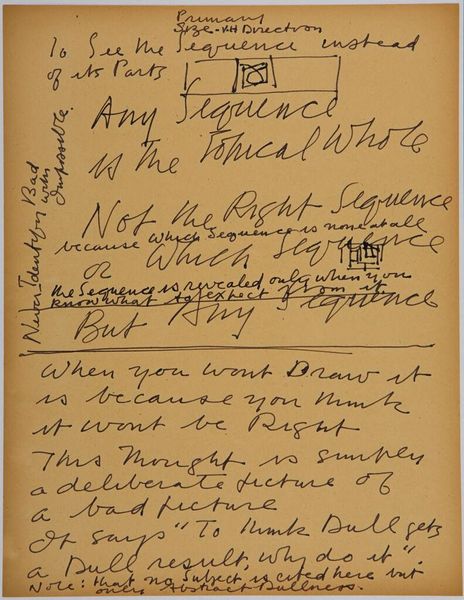 Curator: This intriguing piece is called "Art Theory Text with Star" by Stuart Davis. Editor: It feels like a peek into the artist's mind, like a page torn from a personal notebook. The script is raw. Curator: Exactly. Davis is known for his abstract works, and this text, combined with the small geometric drawing, offers insight into his process, his dedication to finding the unit color, and visualizing elements. Editor: I notice the emphasis on the materials, the white, black, and color itself, it's like he’s breaking down painting to its most fundamental components to reconstruct them anew. The labor is right there on the page. Curator: The handwritten element adds a human touch to what could be seen as a very scientific or mathematical approach to art. Editor: Right. And it's a reminder that even the most abstract ideas are rooted in tangible actions, decisions, and materiality. Curator: A poetic dance between thought and tangible form. Editor: A perfect summary.