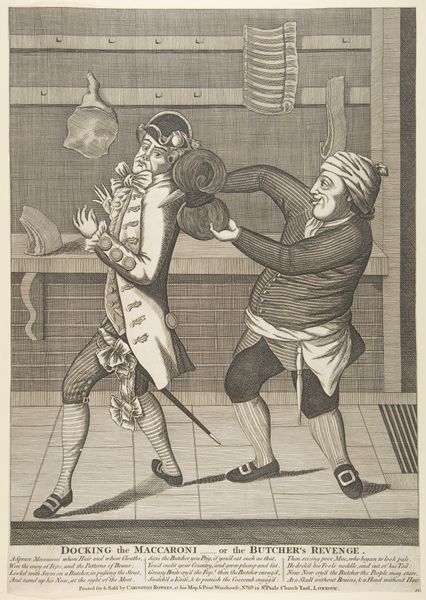 Henry William Bunbury created "Monsieur Le Medicin," a print dating to 1772, now held at the Metropolitan Museum of Art. The composition and lines create a satirical mood through caricature. The doctor is rendered with an elongated face, exaggerated features, and a towering wig, undermining the perception of medical authority. The exaggerated lines and shapes challenge conventional ideas of decorum and respectability. He carries an array of medical accouterments that contrast with his absurd figure. Bunbury employs semiotic elements to mock the medical profession. The text at the bottom is part of the construction of the image as satire: the formal elements, along with the title, all contribute to critique the values and assumptions of 18th-century society. The artwork functions as a cultural critique, questioning fixed roles and engaging with broader themes of social satire and representation.