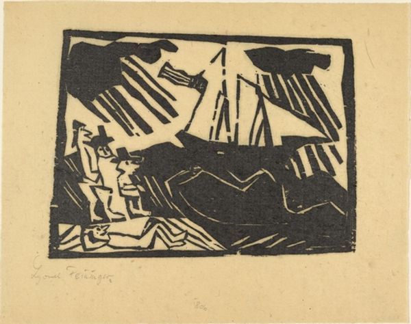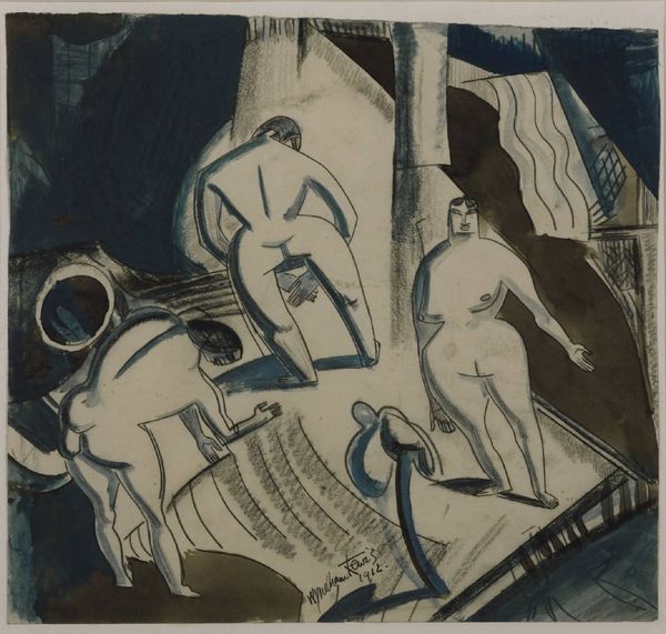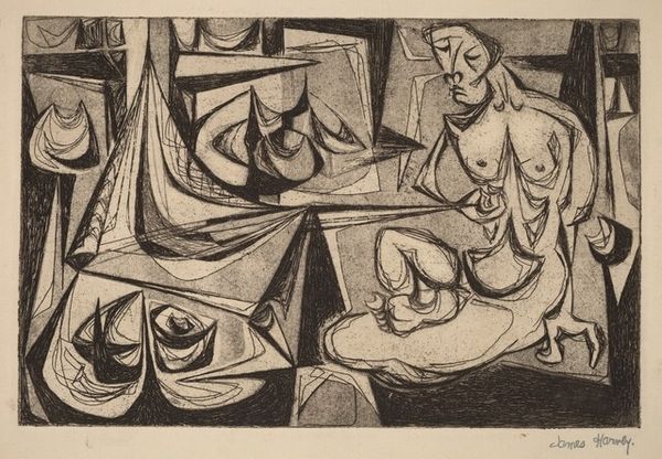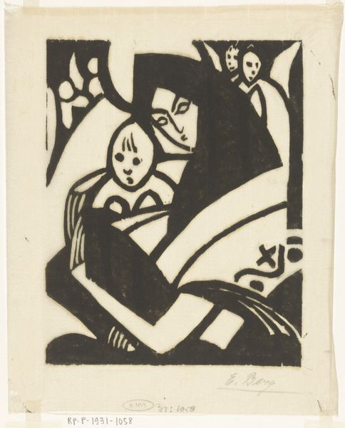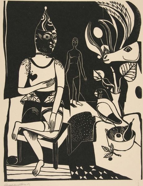Heinrich Campendonk made this "Seated Female Nude with Flower" using woodcut, a relief printing technique. The stark contrast between black and white comes from the artist carving away the negative space from a block of wood, leaving the lines and shapes of the composition raised to catch ink. Woodcut is an old method, historically used for inexpensive reproduction of images and texts. Campendonk is engaging with this history, as well as with the German Expressionist movement, known for its raw and emotional style. The bold, angular lines and simplified forms create a sense of immediacy, as if the image was quickly and spontaneously created. Yet, the precision of the cuts reveals a high level of skill and control, with the artist deliberately leaving areas of the wood block untouched to create areas of solid black. By embracing the material qualities of wood and the graphic nature of the woodcut process, Campendonk challenges traditional notions of artistic value. He shows us that powerful expression can be found not just in the subject matter, but in the conscious engagement with materials and making.