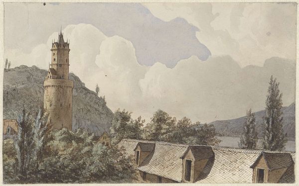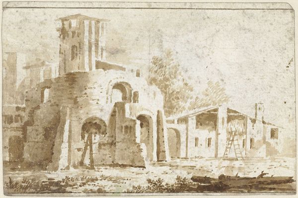 Curator: Here we have John Sell Cotman’s "Sheriff Hutton Castle, Yorkshire," a watercolor created around 1808. What strikes you first about it? Art Historian: The overall effect is melancholy, wouldn't you say? The ruined castle against that vast sky—it speaks of lost power, of the transience of human endeavor. It's like a stage set for a gothic novel. Curator: Indeed. And consider Cotman’s method: the deliberate layering of washes to achieve precise tonal contrasts. It shows a real craftsman’s commitment to process. Look closely; he wasn't merely recording a scene, he was actively constructing it, manipulating the watercolor to emphasize geometric shapes, even within the ruins themselves. Art Historian: Absolutely. These aren't just arbitrary ruins. Castles always represented more than defense; they were symbols of feudal power, social hierarchy. Now, crumbling, they speak volumes about changing social orders and the relentless march of time. Don't you see a warning against hubris in such a decaying monument? Curator: I see changing material conditions. It wasn't divine retribution that crumbled those walls, but the realities of neglect, resource depletion, and changing economic forces rendering them obsolete. The nearby modern thatch roof only amplifies that change! How does new life use the past to house itself today? That says more about our culture and choices than romanticism might allow. Art Historian: Well, history always becomes the stories we tell ourselves, doesn't it? The stark lines remind me of Piranesi's etchings—a kind of artistic "excavation" that reveals not only literal ruins, but also psychological ones. Curator: Agreed, except the method differs and the symbolism, too. Here we see romanticism attempting realism. Rather than a grand allegory about empires, it invites reflection on the slow violence neglect wreaks on stone over time. Notice how, by embracing stark, flat planes of color, Cotman achieves an almost architectural rendering of decay. That itself could be a metaphor for understanding social architecture! Art Historian: A valid point, truly. It's powerful how a relatively simple watercolor technique evokes such somber yet intriguing reflections. Curator: Absolutely. Studying Cotman’s landscape has made me consider what we choose to preserve, and what materials and means decide our future. Art Historian: Yes. It leaves me pondering about the symbolic weight that ruins bear and how we choose to read their narratives over the ages.