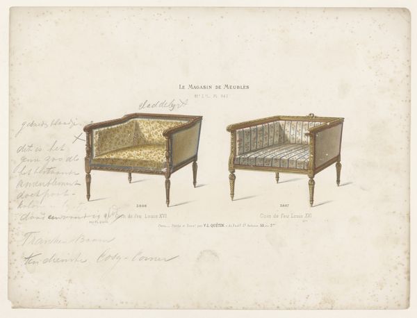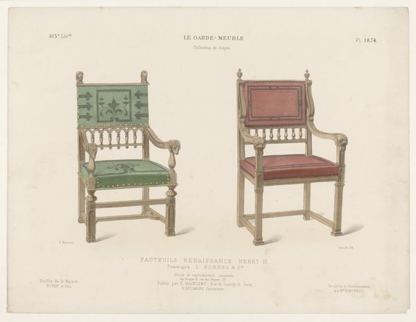 Curator: Let's delve into this print, "Twee bureaustoelen," or "Two Office Chairs," which dates back to after 1878. It presents a comparative look at distinct chair designs, employing etching as its primary medium. Editor: The cool tones of the left chair contrast beautifully with the warmth of the one on the right. It creates an interesting duality. I see formality, but also something vaguely whimsical in the embellishments. Curator: As a print, this work highlights the accessibility of design ideas during the period. The etching process allowed for the relatively easy replication and distribution of these designs, speaking volumes about the growing industrial capabilities and consumer culture of the time. We have moved beyond individual craftsmanship here. Editor: The shapes certainly tell a story! To me, these aren’t just chairs, but thrones of intellect. The embellishments act like heraldic devices, and even the nailhead trim around the upholstery hints at regality and precision. Do they communicate a specific symbolism, beyond office comfort? Curator: While comfort might be secondary from a materialist view, it does demonstrate an evolving understanding of the body within the workspace. Notice the use of decorative art styles—they elevated everyday objects, embedding value through embellished surfaces. Think about the social context in which these chairs might have been found, reflecting particular class identities, spaces of power and governance. Editor: Precisely. They project an idea of leadership and authority; the visual language seems to imply particular virtues and roles in the culture of the time. Imagine the posture each design promotes, the thoughts they facilitate—each evokes an attitude and shapes a world of their own. Curator: In wrapping up, it becomes clear the production of items like these chairs tells us so much more than just their aesthetic; it allows insight into labour and modes of production. Editor: I would agree wholeheartedly; pondering its visual echoes allows us to see objects and artifacts holding entire cultural narratives.