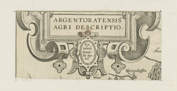 Curator: This intriguing graphic piece, crafted around 1595 by an anonymous artist, presents itself as "Halve cartouche met rolwerk," an engraving on paper. Its graphic quality really sings! Editor: Yes, immediately striking. There's a stark quality to the engraving—a sense of formal reserve, perhaps befitting its presumed function. It really conveys an air of classical authority, though softened somewhat by the swirls and flourishes. Curator: Indeed, the baroque influence is quite evident in the ornamental flourishes and elaborate design of the cartouche itself. But let's consider its purpose. The cartouche, likely part of a larger map, would've framed essential information, lending legitimacy and importance through material presence. The work becomes not just decorative but functional. Editor: And we see that function explicitly written into it! I see, "IAPONIAE INSVLAE DESCRIPTIO," Description of the Islands of Japan! Ludovico Teisera is credited as the author here. Thinking of how such maps would have been used—the institutions that would have commissioned and consumed them—that speaks volumes about Europe’s burgeoning interest in the East. Curator: Absolutely. The materiality here matters deeply. Paper and ink, relatively accessible printmaking techniques, allow for reproduction and wider dissemination of knowledge—a subtle power shift away from unique, handcrafted artworks available only to elites. These allowed, even pushed for, increasingly complex socio-political forces across Europe, changing the way maps are material culture in the 16th century. Editor: Yes, it really is fascinating how these printed images facilitated the construction of geographical knowledge. Disseminating information— but also, implicitly, establishing control. The cartouche, then, is not just a frame but a vehicle for ideology. It speaks of ownership, exploration, and perhaps even a nascent colonial ambition. Curator: Looking at the materials, I wonder about the engraver's tools, the paper mills, the trade networks required. Understanding these systems provides a critical insight to both the artist and author. Editor: Agreed. It offers us insight to what's possible at this period. This piece opens up such avenues of investigation. It allows a deeper appreciation not only for the aesthetic but also for the societal framework.