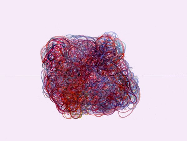Stepan Ryabchenko made this digital artwork, "Alchemicus Redolent," with software that gives it a particular type of finish. The colour palette is fascinating, as it has both an appealing dreamlike quality, and something of a sickly sweet feel like overripe fruit. Ryabchenko uses the medium to create a world of glossy surfaces that both attract and slightly repel. Note the way the forms are modeled with gradients of light and shadow, so that the whole piece feels like it has been rendered to within an inch of its life. The disc on the top of the composition, sits on the form like a hat, adding a playful, surreal touch, like Philip Guston wearing a hat. Digital art like this is exciting as it continues painting’s dialogue with other media by further embracing the artificial and unreal. Its open endedness is its strength.