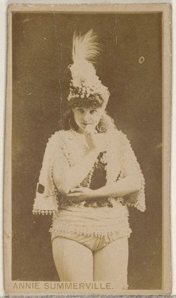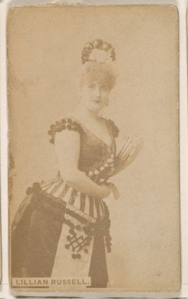 Curator: Let’s take a look at this small, colourful print. It's part of a series called "Actors and Actresses" created between 1888 and 1889 by W. Duke, Sons & Co. for their Duke brand cigarettes. The work depicts Janauscheck in European costume dating back to the late 15th, early 16th century. Editor: The first thing that strikes me is the palette. It’s vibrant, almost shockingly so, given the historical reference. It's surprising for what is essentially cigarette packaging—colourful pencil and watercolour illustrations, quite nicely done, on something so disposable. Curator: It’s interesting to see the historical costume represented in this format. Janauscheck was a popular actress, and this image suggests a desire to elevate the product through association with high culture, appealing to aspirations and consumer desires. These cards were collectible, promoting brand loyalty but also acting as visual tools for a wider public. Editor: The materials also play a part. The thin paper stock speaks to mass production, yet the detail in the illustration and the applied colour gives it an air of artisanal craft, even though it was undoubtedly printed en masse. What were the working conditions like for those creating these cards? How were they distributed and collected? The labour of making these is worth further investigation. Curator: Indeed. The image is striking, clearly designed to capture attention and evoke a sense of quality and luxury in a time when advertising was still developing. It shows how mass-produced items leveraged history and celebrity to build perceived value. It catered to a growing consumer market eager to engage with narratives of elegance. Editor: This blend of industrial production with apparent artisanal flair brings the contradiction to light. Was it empowering consumers, or were they unknowingly being used for a commercial narrative? Thinking about the circulation of imagery and consumer behaviour through such everyday objects offers plenty to unpack. Curator: Looking at how this particular brand deployed art reveals much about societal values at the time, the commodification of performance and art for capital gain. It provides valuable context about our visual culture. Editor: Ultimately, these trading cards illuminate our culture’s connection between consumption, identity, and art. They offer insights into a period when material objects started speaking volumes about our place in the social order.