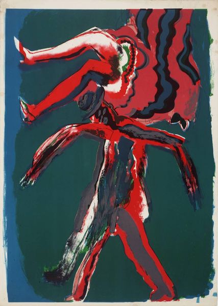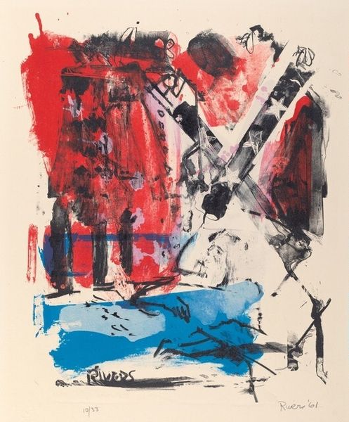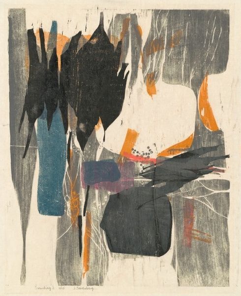 Editor: This is "Tokens VIII," an etching by Garo Antreasian, created in 1961. There's a striking contrast between the fiery red and deep black, almost like a landscape consumed by intense emotion. What do you see in this piece, especially given its creation in the early 60s? Curator: Well, its abstract expressionist style immediately situates it within a postwar context, where artists grappled with trauma and societal shifts. That intense red, combined with the chaotic linework, could be read as a response to Cold War anxieties, a visual representation of societal tension and the looming threat of nuclear annihilation. It’s interesting how Antreasian uses abstraction to convey a sense of unease, of something just below the surface about to explode. The title, "Tokens," also suggests a fragmented reality, reduced to symbols or signs of a larger, perhaps irretrievable, whole. Do you pick up on any specific signs of political expression? Editor: The way the dark, undefined space looms above definitely feels heavy. And I hadn’t thought of "Tokens" as fragmented, but that makes sense. Is it possible that abstraction itself was a political statement, a rejection of more traditional, representational art forms? Curator: Absolutely! Embracing abstraction can be interpreted as a challenge to established norms, a refusal to depict a world perceived as broken or dishonest in a traditional manner. Consider the societal pressures of conformity during that era; an abstract artist, through their art, was inherently questioning those structures. The bold use of color, especially red, might even symbolize revolutionary spirit, a refusal to be silenced or subdued. Do you find that interpretation convincing? Editor: Yes, thinking about the historical context really deepens the impact. I was initially just reacting to the visceral feeling, but now I see it’s layered with political and social meaning. Curator: Exactly. Art doesn't exist in a vacuum; it’s always in dialogue with the world around it. Looking at it through that lens unlocks so much more. Editor: I'll definitely remember that when I view abstract pieces from that period. It completely transforms how I see the piece.