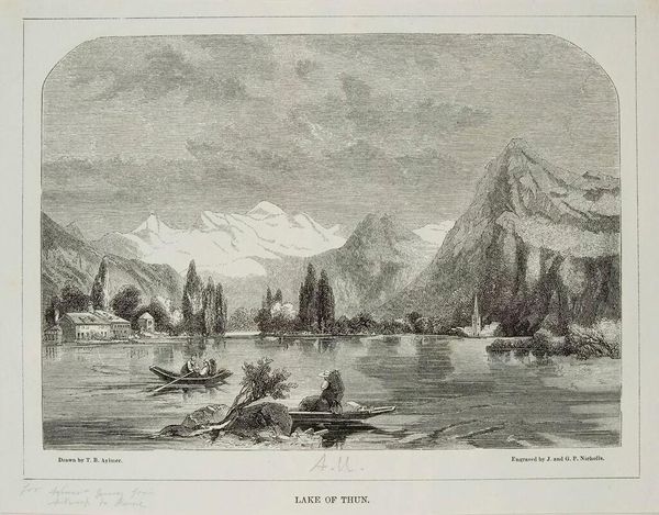 Curator: Welcome. We're looking at "Lake of Como" by George Pike Nicholls. Editor: It's charming! The detailed linework creates such a serene and picturesque scene, doesn't it? Curator: Absolutely. This print comes from a time when travel was becoming increasingly accessible, and imagery like this played a key role. Consider the title above the image: "An Artist’s Ramble from Antwerp to Rome." Editor: I see that the landscape is carefully structured, leading the eye from the foreground figures to the distant mountains. There's a real sense of depth. Curator: It offered those at home a taste of the Grand Tour, shaping perceptions of Italian landscapes and culture, and, in turn, fueling a desire to participate in that vision. Editor: It’s a fascinating depiction of how art can both reflect and influence our understanding of place. Curator: Indeed. It’s a slice of cultural history rendered in ink.