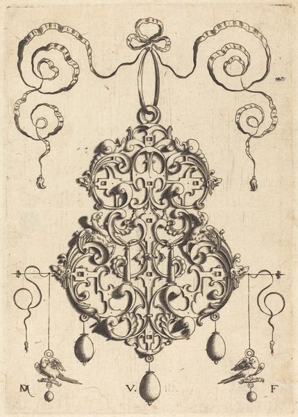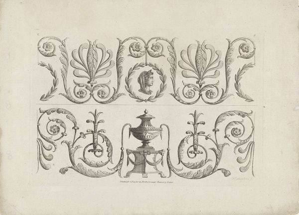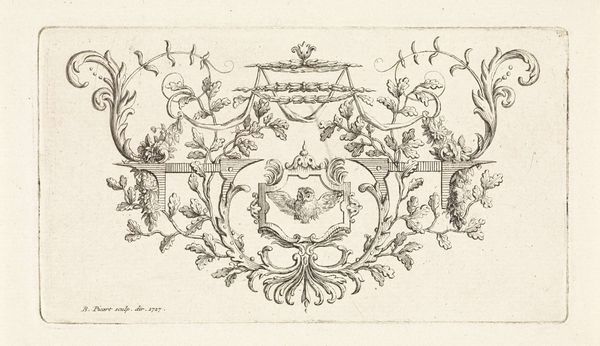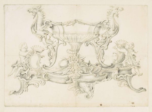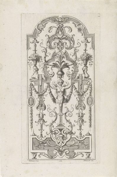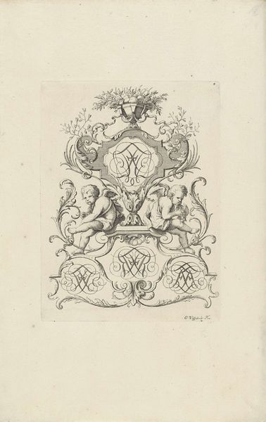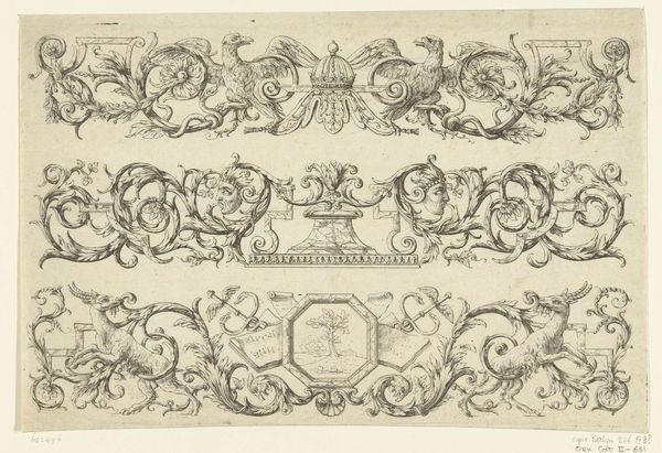 Editor: So, here we have "Three Designs for Silver Mounting with Figures," an engraving likely created between 1705 and 1735, though the artist remains anonymous. It feels very whimsical to me. What strikes you about it? Curator: Whimsical indeed! It’s like stumbling upon a secret language whispered by swirling lines. For me, it's the Baroque's exuberance channelled into miniature. It's an intimate explosion of ornamentation meant to adorn everyday objects, elevating them to something precious. Look at how the animals play along the edges; aren’t they delightful? It’s almost as if the artist is saying, "Why can’t the functional be fantastical?” Editor: Absolutely! It’s like visual candy. I hadn’t really considered the domestic aspect, that someone might’ve handled something like this every day. Curator: Precisely. This wasn't art meant for a museum, originally. Think of a wealthy person in that period... wouldn’t owning a piece of silverware with an extravagant ornament elevate their status? In this time artists aimed to dazzle you in small scale. Are there certain forms that strike your eye the most? Editor: I suppose the symmetrical compositions on either corner of the drawing do the trick for me. Curator: Symmetry can be pleasing to the eye, can't it? It reminds me how we unconsciously find beauty in structure and order, something that brings a sense of peace. I wonder, what everyday object today deserves to be ennobled with such intricate art? Editor: Hmmm, that’s a good question! Maybe our phones? I'm seeing it, diamond encrusted… Curator: (Laughing) That’s definitely Baroque spirit in the 21st century. Thanks, now I want one!