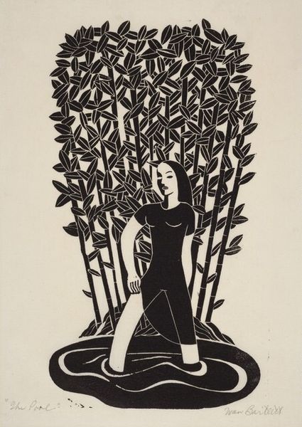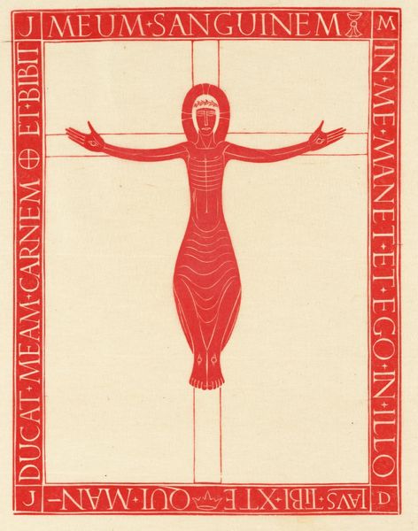 Editor: This is Eric Gill's wood engraving, "Our Lady of Lourdes." It's striking, isn't it? All those sharp lines, the stark black and white... What symbols do you see at play here? Curator: The serpent, crushed underfoot, is a powerful echo of Genesis, of course. Mary as the New Eve, undoing the original sin. And those radiating lines – are they light, grace, power emanating from her? Gill is very deliberate in his use of iconic visual language. Editor: So, it's about layering those historical and religious symbols. Is the simplicity of the image part of that? Curator: Precisely! Stripped down to its essentials, the image allows those core symbols to resonate more deeply in our cultural memory. Think of how the halo works, too – a visual shorthand instantly recognizable. Editor: It's amazing how much meaning he packed into such a simple form. Curator: Indeed. Gill understood the enduring power of images to convey complex ideas and emotions across time.