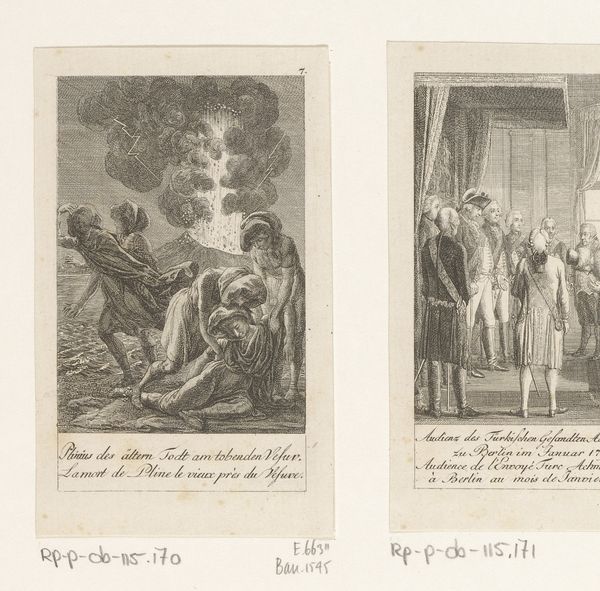 Curator: Look closely at this 1785 engraving by Daniel Nikolaus Chodowiecki, titled “Ruzie tussen Falstaff en de waardin in bijzijn van Henry en Bardolph,” housed here at the Rijksmuseum. Editor: It strikes me immediately as rather theatrical, doesn't it? The scene is tightly framed, almost claustrophobic, intensifying the sense of conflict between these figures. Curator: Indeed. Chodowiecki, a prominent figure in the Berlin Academy of Arts, was known for his narrative prints. This piece exemplifies his commitment to illustrating stories, in this case drawing from Shakespeare's "Henry IV." It presents a vivid snapshot of a dispute between Falstaff and the Hostess, a scene steeped in social and political tension. Editor: What particularly grabs me is the portrayal of Falstaff himself. He embodies excess, literally overflowing his britches, right? His puffed-up posture seems designed to intimidate, a theatrical performance of masculinity and authority in a very precarious balance. Curator: Precisely. His presence, juxtaposed against the other figures – Henry, Bardolph, and the Hostess – speaks volumes about power dynamics and societal hierarchies. He challenges traditional notions of nobility. Note how the artist places him within the confines of a tavern, a liminal space, which reflects the anxieties around class and social mobility in late 18th-century Europe. This reflects a fascination with common people. Editor: And the Hostess? I find her equally compelling. She seems defiant, rooted in her own space, refusing to be intimidated by Falstaff's bluster. To me, the struggle isn’t simply about money or a bar brawl, but also one between an established male dominance and a woman claiming her due in a very male world. Curator: Absolutely, it provides insight into a broader context and into how we conceptualize our identities, our gender roles, our politics through everyday dramas. Editor: Examining this print reminds us that art is always in conversation with the historical moment from which it emerges, providing a valuable space to investigate power relations within and beyond. Curator: I agree. Chodowiecki offers not merely an illustration of Shakespeare, but a lens through which to examine the intricacies of 18th-century social life.