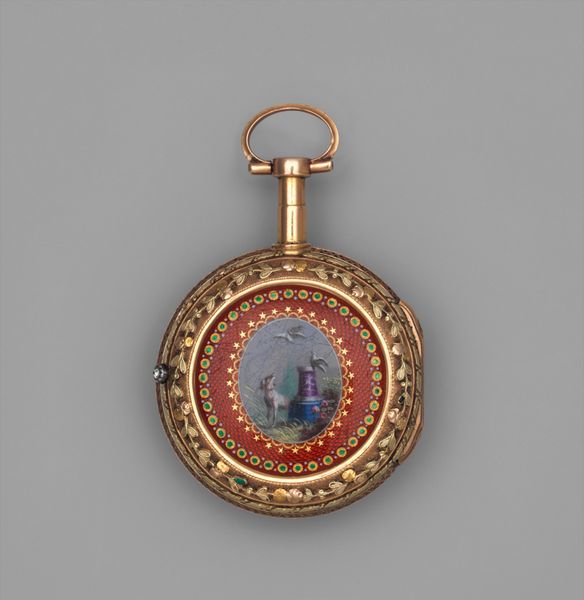 Curator: Here we have an exquisite “Watch,” crafted between 1778 and 1795 by Daniel Vauchez. It’s currently held at the Metropolitan Museum of Art. Editor: What strikes me immediately is its opulence. The glint of gold, that meticulously painted enamel miniature… it's pure, decadent Rococo! Curator: Indeed. The Rococo style really thrived on playful themes, and of course, luxury. Vauchez, as a master watchmaker, caters to a wealthy clientele eager to flaunt the cutting-edge technology of the time, hot air balloons, with the most precious of materials. Editor: Exactly. We’re not just talking about timekeeping here; the gold and enamel transforms the watch into an object that broadcasts social standing, highlighting both the technological marvel of the balloon and the labor that went into extracting and fashioning the metal itself. Curator: And that miniature painting within the watch case? Such tiny detail! It captures the excitement around early balloon flights—a moment of spectacle and technological promise. The men attending to the balloon from ladders really captures the thrill of innovation and forward thinking of the day. Editor: True. The image becomes less about recording time and more about symbolizing ambition. This level of production speaks volumes about consumption patterns and available resources for these affluent people. What's compelling is that painting and the meticulous ornamentation are intertwined, elevating the watch beyond mere function. Curator: Absolutely. In its day, a piece like this was designed to demonstrate sophistication and worldliness; a symbol that progress was something tangible that could literally fit in your pocket! Editor: It really provides an insight into the material lives and status aspirations of the upper class, demonstrating just how entwined wealth was with industrial advancement. I now understand the purpose of making an item like this; it speaks to more than wealth! Curator: It's incredible how such a small object speaks volumes about the era that created it. Editor: Indeed. Examining art through the lens of materials and processes opens new ways of viewing objects like this and encourages us to consider our own values too.