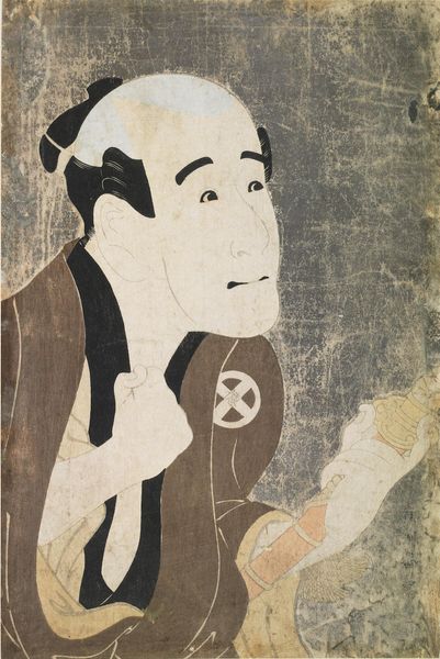 Tōshūsai Sharaku's woodblock print presents the actor Otani Tokuji I as a manservant named Sodesuke. Created in Japan during the Edo period, this work captures a moment in Kabuki theater, a popular form of entertainment marked by elaborate costumes, stylized movements, and all-male casts. Here, the actor embodies a character from a specific societal position, that of a servant. The print doesn't just depict a role; it encapsulates a network of power dynamics. Kabuki often explored themes of class, duty, and social mobility, reflecting the era's complex social fabric. Sharaku's choice to portray this actor in this role may be seen as a reflection on the performative nature of identity, and the blurring lines between stage and reality. Notice the actor’s expression of slight surprise, and how he holds the object in his hand. These details add a layer of emotional depth, inviting us to contemplate the narratives and hidden meanings within the print.