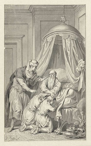 Editor: This engraving, titled "Heilige Familie" or "Holy Family," is attributed to Battista Angolo del Moro and dates back to somewhere between 1524 and 1575, placing it firmly in the Italian Renaissance. There’s a striking contrast between the clean lines and the busy scene. I find the arrangement of figures fascinating… it feels both balanced and a little chaotic. What are your impressions? Curator: I'm immediately drawn to how this print communicates a powerful sense of lineage and legacy through its composition. Notice how the artist has placed the bathing child centrally, a potent symbol of new beginnings and purification. It recalls earlier visual traditions of baptism and cleansing. What kind of meaning might baptism have at this time? Editor: Possibly, the purification of sin… a fresh start. But that door looming behind, what’s with that? Curator: Ah, a liminal space. Note the inscription above. "MAG INVENT. IVL. ROM." Roughly translated "Great Invention of Julius in Rome." Perhaps pointing towards an artist from the circle of Giulio Romano, hinting to its place of artistic creation. It serves as both a background and a symbolic threshold. Consider its visual weight – it seems to suggest that faith, renewal and birth are happenings within and framed by tradition, in this instance artistic traditions of the time. How does that doorway impact your perception now? Editor: That's compelling, framing faith and tradition, giving artistic weight… I see that connection now. Thanks, I now see a deliberate interplay between the immediacy of birth and baptism and the enduring power of tradition. Curator: Exactly, it highlights that images themselves carry cultural memory and continuity, offering insights into the artist's, and our, relationship with faith and history.