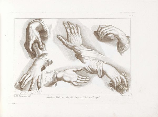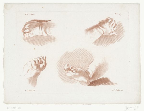 This is Francesco Bartolozzi’s etching, 'Five Hands and Five Feet of Children.' Notice the disembodied, almost sculptural arrangements against the stark white background. It gives the impression of floating forms rather than a study of live children. Bartolozzi masterfully employs line and shadow to capture the soft contours of infant limbs. The stark contrast between light and shadow lends depth, emphasizing their plumpness. The hands and feet are carefully arranged in various poses, drawing your eye across the composition. The study challenges traditional portraiture, focusing instead on isolated body parts. It questions the complete, unified figure, presenting a fragmented view of the human form. This challenges fixed notions of the body, reflecting broader philosophical shifts toward deconstruction and the questioning of wholeness. Bartolozzi’s fragmentation invites us to reconsider how we perceive and represent the human body.