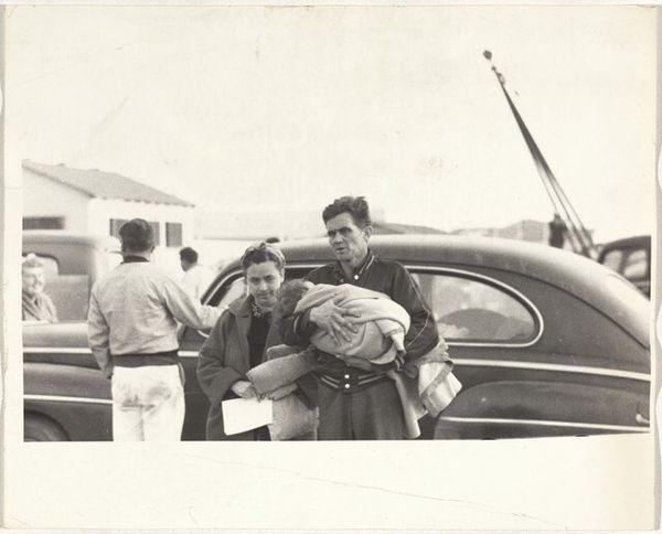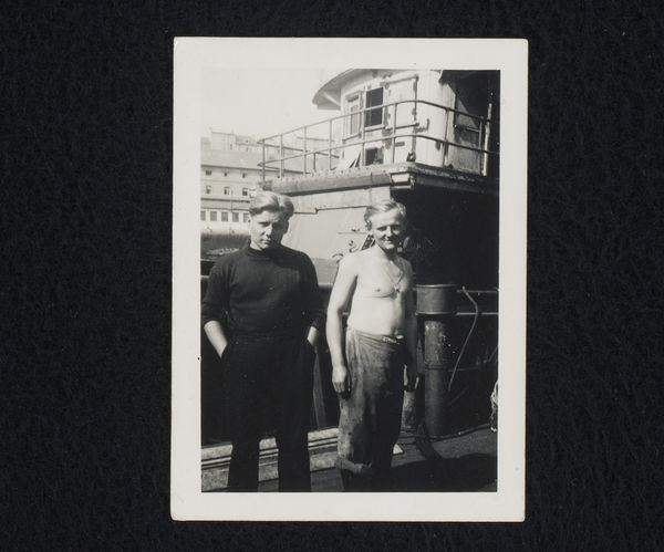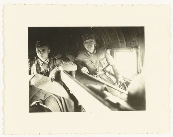 Curator: The texture in this photograph immediately pulls me in – the way the light catches the fabric inside the car, contrasting with the smooth, reflective surface of the vehicle itself. Editor: And it’s that play with texture that Frank does so well. This work, titled "Women in automobile--Hollywood," was captured in 1956 as part of his groundbreaking project, “The Americans.” Curator: Groundbreaking indeed! It possesses such quiet intimacy. The figures are shrouded, almost ghost-like, within the confines of the car. I find myself pondering what their expressions conceal. There’s something universally relatable about being an anonymous observer within the safe remove of a vehicle. Editor: I agree, that anonymity is palpable. It speaks to the burgeoning car culture of post-war America and also hints at deeper questions about identity and privacy within this manufactured ideal. The open road, once a symbol of freedom, perhaps becoming a space for introspection, even isolation. Curator: Absolutely, the car window functions almost like a proscenium, framing a fleeting, unguarded moment. The symbolic weight of Hollywood itself— dreams manufactured and consumed—adds another layer. What are we actually seeing here: people or carefully constructed roles? Editor: And seeing this work through the lens of Robert Frank, a Swiss immigrant documenting American life, adds another dimension. He was an outsider, keenly observing and often critical of the societal structures and inequalities he witnessed. There is a sense of unease here in what feels like a voyeuristic moment. The photo speaks to how a country celebrated and promoted certain roles that are, in themselves, exclusionary to a broader sense of identity. Curator: Indeed. What appear to be the mundane aspects of an otherwise straightforward scene in this street photograph hint at broader concerns: gender dynamics, celebrity culture, the silent performance of being. Thank you for bringing this to my attention. Editor: My pleasure. Hopefully, visitors find similar threads to tug on in the work as well!