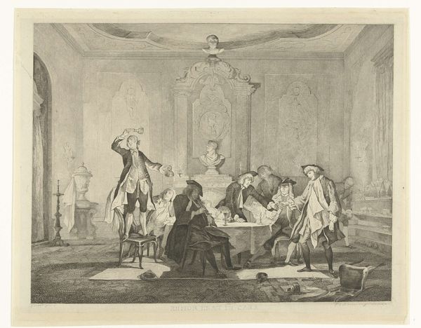 Editor: Here we have "Sleeping Congregation," an early 19th-century drawing by John Thurston, rendered with a mixture of chalk, pen, ink, pencil, and gouache on paper. It certainly lives up to its name, depicting figures dozing off, seemingly during some lecture or service. What can you tell us about it? Curator: Looking at "Sleeping Congregation," I'm immediately drawn to Thurston's process. Notice how he combines seemingly disparate materials: chalk, ink, gouache. This suggests a layered approach, building the image through various stages of production. The combination of such readily available, perhaps even quotidian, materials blurs the lines between "high" art and the materials of everyday life. Consider what that tells us about the availability of artistic materials for artists, and Thurston's labor in creating this drawing. What do you make of the contrast between the figures' apparent boredom and the labor involved in producing the image? Editor: That's a fascinating way to frame it! It highlights the inherent tension: the subjects are disengaged, while the artist clearly invested considerable time and effort. The materials being rather modest perhaps also implies it was created outside traditional academy contexts? Curator: Precisely! Think about the context – 18th and 19th-century England, burgeoning industrialization. Thurston’s choice of medium could be read as a comment on accessible art forms for the masses. Consider this scene alongside the larger economic system where literacy and education was becoming increasingly available as cultural capital. Are these people resisting education or something else? Editor: It reframes how I look at it. The focus on materials and process really grounds the piece in its social and historical context, pointing towards broader issues of labor, class, and accessibility to resources and education. Curator: Indeed. Seeing art as the result of material choices and social conditions allows for a more grounded, relevant, and challenging interpretation. Editor: Absolutely, thank you for shedding light on the social commentary embedded in Thurston's "Sleeping Congregation"!