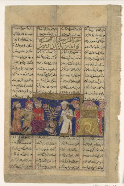 This is a painting and text block from a Khamsa—or Quintet—of Nizami of Ganja. It depicts Alexander the Great in discussion with seven sages and is an artifact from a manuscript tradition deeply embedded in Persian culture. The painting invites us to consider the dynamics of power and knowledge within a historical context. The figure of Alexander, a powerful ruler, is shown seeking wisdom from a collective of learned individuals. This speaks to the importance of counsel and intellectual exchange in governance, but also hints at the exclusivity of such dialogues, as they often exclude the voices and experiences of the majority. The arrangement of the figures, with Alexander slightly elevated, suggests a hierarchy, yet the act of seeking advice implies a recognition of the sages' expertise. This tension highlights the complexities inherent in leadership and the negotiation between authority and communal knowledge. The artwork encourages us to reflect on the importance of knowledge, the dynamics of power, and the voices that shape historical narratives.