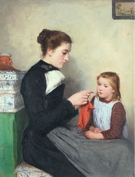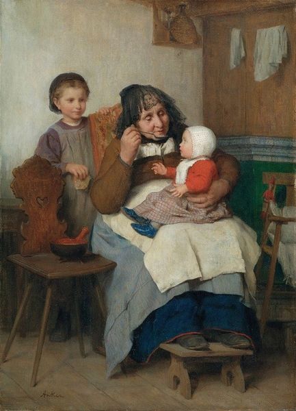 Albrecht Anker painted “Bertha Gugger with daughter” in Switzerland, capturing a seemingly simple domestic scene. But it's worth considering how social and economic forces shape what appears in the image. During the 19th century, Switzerland was undergoing rapid industrialization, yet traditional values and family life remained central to its national identity. Anker, trained at the École des Beaux-Arts in Paris, returned to Switzerland and focused on genre paintings depicting rural life, particularly children. Here, the mother is knitting, a common domestic task, while the daughter watches attentively. Anker idealizes the mother-daughter relationship, presenting it as a nurturing and harmonious bond. To understand Anker’s work better, we can explore the history of Swiss painting and examine the economic structures that shaped the lives of ordinary people. Such resources can help us interpret the meaning of the art and to recognize it as deeply shaped by social and institutional context.