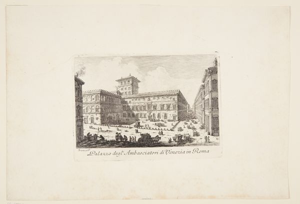 Peter Haas created this print of the new Mint Building on Werderschen Market in Berlin. The monochromatic tones and precise linework immediately evoke a sense of ordered clarity and the formal ideals of the era. The print’s composition emphasizes the architectural structure of the Mint Building itself, a solid, imposing edifice that dominates its surroundings. Haas has meticulously rendered the building's facade, paying close attention to the symmetry of its windows and the classical details of its design. This attention to detail serves to highlight the building's rational structure, embodying Enlightenment values of order and reason. The building’s solidity is juxtaposed with the lively market scene in front of it, filled with human figures engaged in commerce and daily life. This contrast invites contemplation on the relationship between the abstract order of institutions and the messy vitality of lived experience. Haas’s work offers a fascinating glimpse into the visual culture of the late 18th century, revealing how architectural forms were used to communicate ideas about state power and social organization.