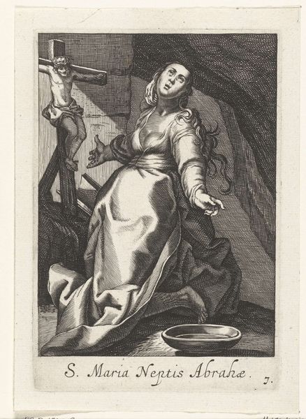 This engraving titled 'Vroomheid', or piety, was made by Willem van Swanenburg in the Dutch Republic. The image presents an allegory of faith or religious devotion, figured as a woman looking up to heaven, a book of religious law to her side. The Dutch Republic in the early 17th century was a place of relative religious toleration and, as a result, it attracted diverse communities of faith. Yet it was also a deeply Calvinist society where outward shows of piety were demanded from all. This image reflects that demand, with the figure’s humble gaze and plain clothing marking her out as virtuous. At her feet, she tramples symbols of worldly wealth; meanwhile an angel descends to offer her a laurel wreath – the reward of piety. The work makes extensive use of Christian imagery and symbolism that would have been instantly legible to its contemporary audience. Yet its classical composition reminds us of the institutional setting in which Swanenburg trained: the University of Leiden. By researching the artist's life and the historical context, we can better understand the values that this image promotes.