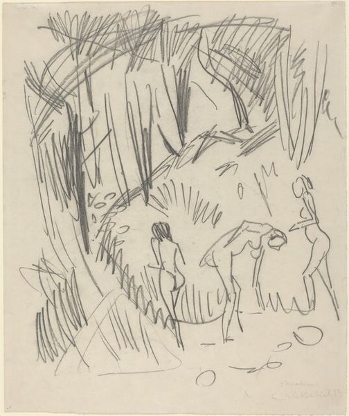 Curator: Looking at this expressive drawing from 1921 by Richard Seewald, titled "Goats," I'm immediately struck by how unsettled it feels. The lines are so jagged and frantic. Editor: I agree. It's certainly not a serene pastoral scene. The animals and landscape elements are all rendered with a nervous energy. What do we know about the context of Seewald's work at this time? Curator: Well, Seewald was associated with Expressionism. The prevailing feeling of pre-war optimism was over and artists grappled with the trauma of conflict. This graphite and ink drawing may reflect this cultural shift in artistic expression. The goats, especially, don’t appear peaceful. Editor: Exactly. The way the goats are depicted—one seemingly mid-leap, suspended—suggests an attempt to escape something, or perhaps an awkward balance in their environment. In many cultures, goats symbolize virility, stubbornness, but also resourcefulness. Curator: Right. Given the social climate of the 1920s, it might also be seen as a commentary on societal instability. The lack of a clear focal point emphasizes a kind of disarray or even panic. Editor: I notice the spiky plants, almost weapon-like. Even the sun looks harsh and unwelcoming, far removed from traditional symbols of warmth or divine presence. It's as if Seewald deliberately stripped away any comfortable or idyllic imagery. Curator: Yes, it could be that this unsettling portrayal reflects post-war disillusionment. The seemingly simple subject of animals in nature carries much deeper connotations. Editor: Absolutely. Seewald manages to tap into something primal. I find that despite the rough style and seemingly simple choice of subject, it prompts questions about survival, resilience, and adaptation in a turbulent world. Curator: A fresh perspective on how the effects of conflict are visible, not only on society, but on its art and its symbolism. Editor: A stark but intriguing reflection of the times, seen through the distorted mirror of pastoral life.