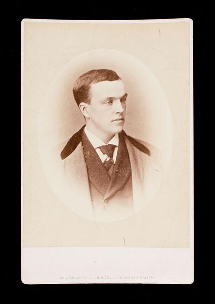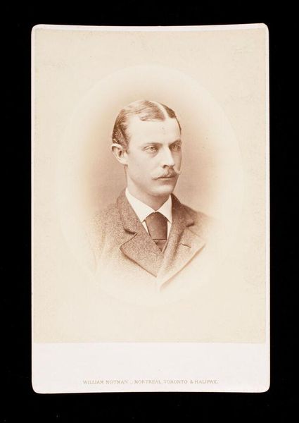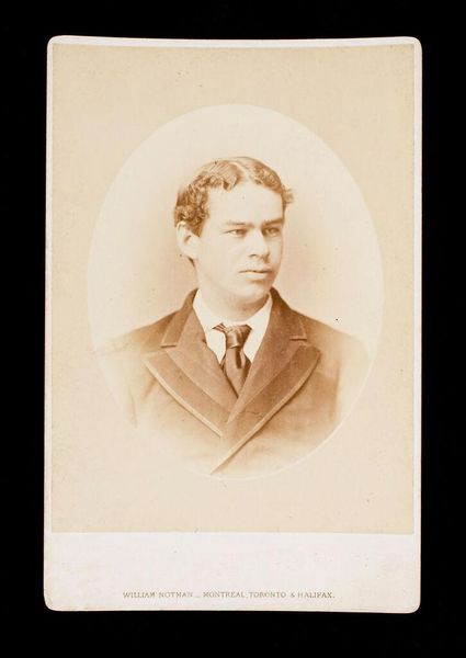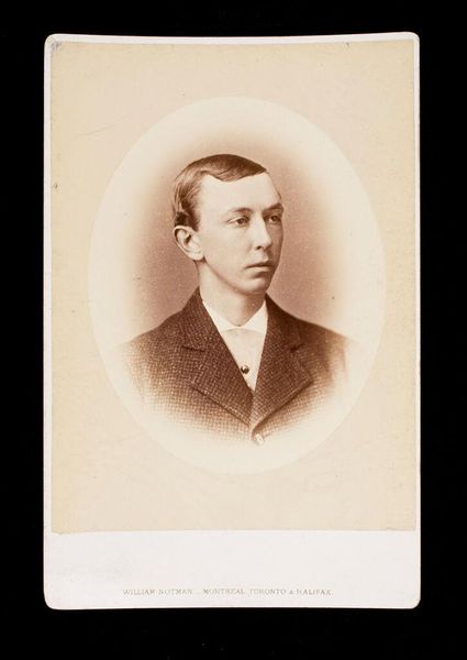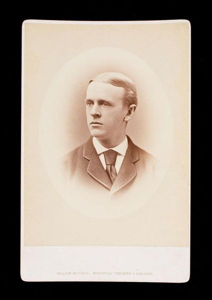 Curator: William Notman’s "Untitled (bust length portrait of clean shaven man labeled George R. R. Rivers, A.B. 1875)" is an albumen print mounted on cardstock. It's hard to escape the feeling of a bygone era, a rigid formality. What do you see in the portrait's staging? Editor: The subject seems trapped by the conventions of his time. The neat suit and tie, the almost airbrushed skin--it's an image meticulously constructed for public consumption. Curator: Exactly! How do you think that the subject’s identity intersects with societal expectations of masculinity and class in the late 19th century? Is there something performative about this portrait? Editor: It feels like this image, and likely others like it, created and perpetuated a standard for young, educated men. Something both aspirational and restricting. I hadn’t considered how photography itself could shape those expectations. Curator: Indeed. Notman's portrait serves as a fascinating lens through which to consider the constraints and aspirations of late 19th-century identities. Editor: I agree, there is much more than initially meets the eye.