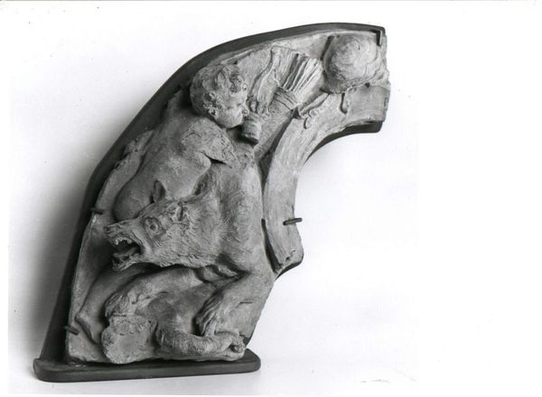 Editor: This is "Sammenkrøbet mand med vædderhorn og vandsæk," or "Crouching Man with Ram's Horn and Waterskin," a wood sculpture by Anders Bundgaard, created sometime between 1879 and 1937. The monochrome gives it an archaic, almost biblical feel, wouldn't you agree? What do you see in this intriguing work? Curator: It whispers to me of primal struggles, of the weight of existence. That crouching figure, the rough-hewn wood... It's raw emotion, isn’t it? Bundgaard wasn’t just sculpting wood; he was wrestling with ideas of humanity's burden. That ram's horn, a symbol of strength and stubbornness, yet here, it feels… deflated? A strange combination with the waterskin. Does it imply that he's sustained but exhausted by life's journey? What is your take? Editor: I was going to suggest maybe the waterskin refers to being full of oneself, while still appearing burdened. Maybe he saw some irony there? The waterskin might also simply represent sustenance. It is a very peculiar coupling of symbols, as you say, the strong horn, yet huddled figure. Curator: Yes! The contrast. That’s Bundgaard's magic, I think. He gives us these familiar symbols and twists them. Is the crouch a defense, a defeat, or simply a moment of respite before the next climb? He invites us to complete the story. And isn’t that what great art does? It's like catching a fragment of someone else's dream. You start painting your own over it. Editor: Absolutely. It certainly sparks my imagination more now than at first glance. I love how the raw, carved wood gives the figure an immediate feeling of groundedness. Curator: Exactly! And you start to wonder, what burden would cause such a strong ram to curl in on itself? I shall now pose with it! Thank you. I may or may not do a better pose. Editor: (Laughs) Thanks, that gave me a lot to consider. A solid choice for further pondering on my walk home!
